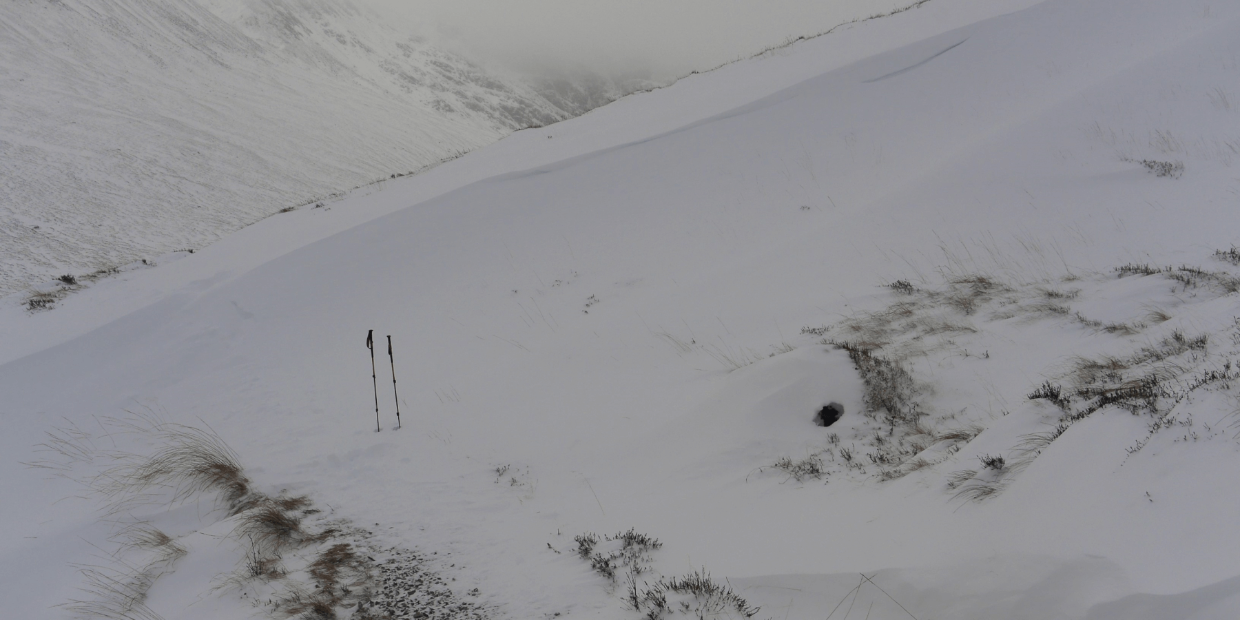 Deep snow at all altitudes - very hard going on foot. Knee deep at 300m! A day of flat light and no definition cloudy on the tops. Winds 20 -30 mph on the tops.