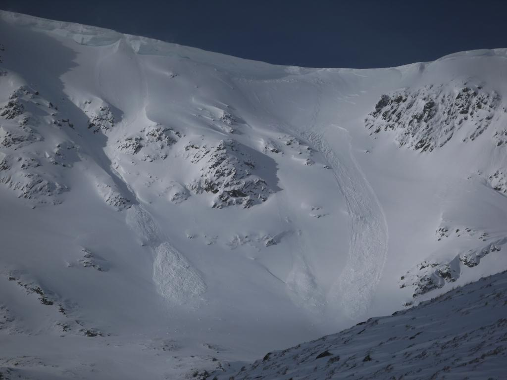 Drifting followed by consolidating trendSome new snow and windslab development preceded heavy drifting. This resulted in some instability and avalanche activity triggered by cornice collapse due to overloading, combined with a slight rise in temperatures. Following this avalanche cycle milder conditions have resulted in a slowly consolidating spring snowpack which is confined to the high coires and major gully lines. The greatest cover lies on North-West through North to East aspects above 900 metres.
