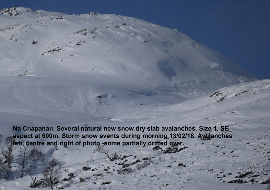 Fresh snowfall followed by some high avalanche activity at the start of the period with several events in Inner coire Ardair NE through E aspects. Further snowfall through the period maintained areas of poorly stabilised slab which became more widespread in variable winds. A feature throughout has been the high level nature of the instabilities and whilst some run out zones affected terrain down to 700m the hazard remained for the most part high on slopes above 900m.