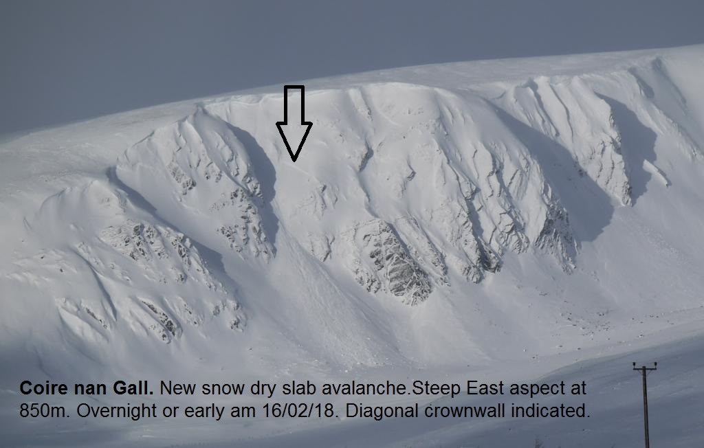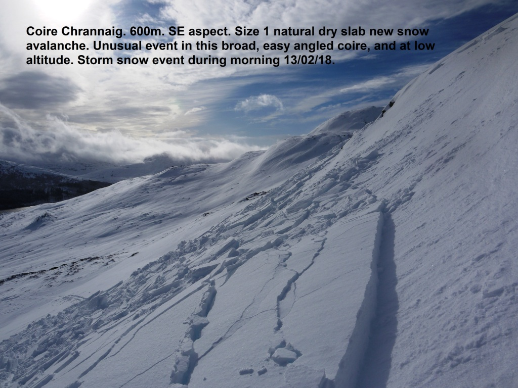 Little or no snowfall but cold early in the period sustaining localised instability in mature windslab on many aspects. Deeper deposits on some steep East to South aspects had widening full depth glide cracks and conspicuous buckling of slab as temperatures eased. Full depth avalanche activity on South East and East aspects at around 750m in Coire Ardair and Coire Choile Rais on 11th Feb in milder weather. Size 3 avalanche in Coire Ardair.