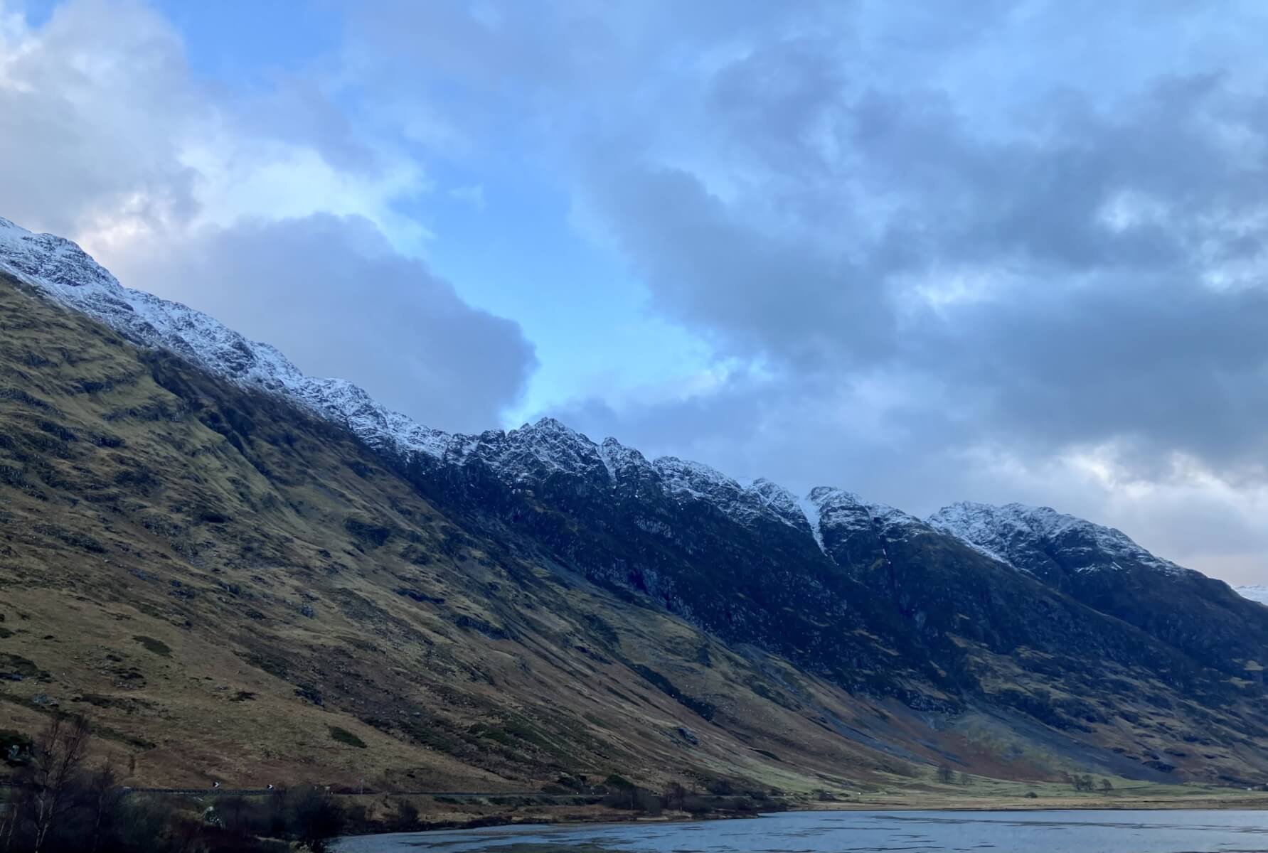 Colder now with new snow...This past week has been very mild with rain and strong winds, this combination practically depleted all the snow cover leaving only isolated patches of thawing snow in very high sheltered locations. Then, late yesterday afternoon 17th December the freezing levels lowered and fell to around 450 metres, the rain turned to snow showers at higher elevations. New snow accumulations at present are generally quite shallow and fell to around 360 metres particularly at the more easterly end of Glencoe.