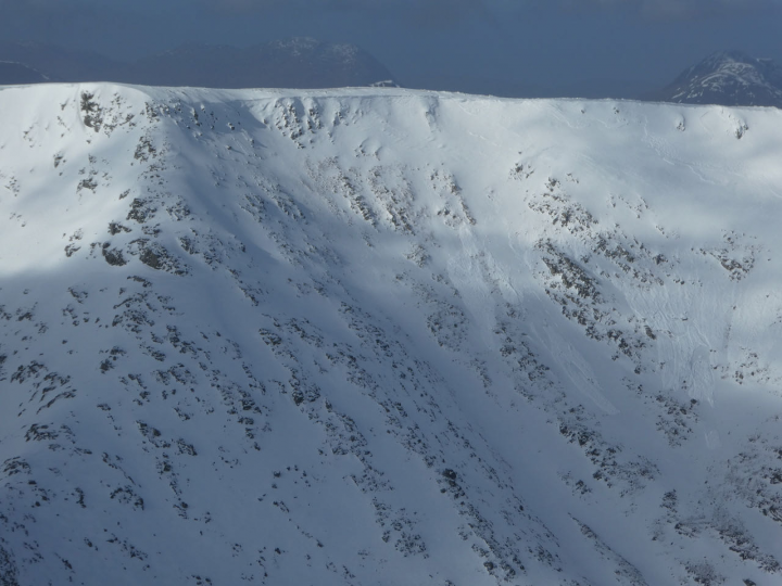 A generally cold and wintry week with lots of fresh snow and strong winds depositing large areas of windslab and maintaining a Considerable avalanche hazard. There were a couple of settled days (Friday and Tuesday) with reasonable visibility when avalanches were recorded including few size one ski cut avalanches and a large natural avalanche on Stob na Doie. There was likely other natural avalanche activity not recorded on other days due to the poor visibility. Some large cornices exist.