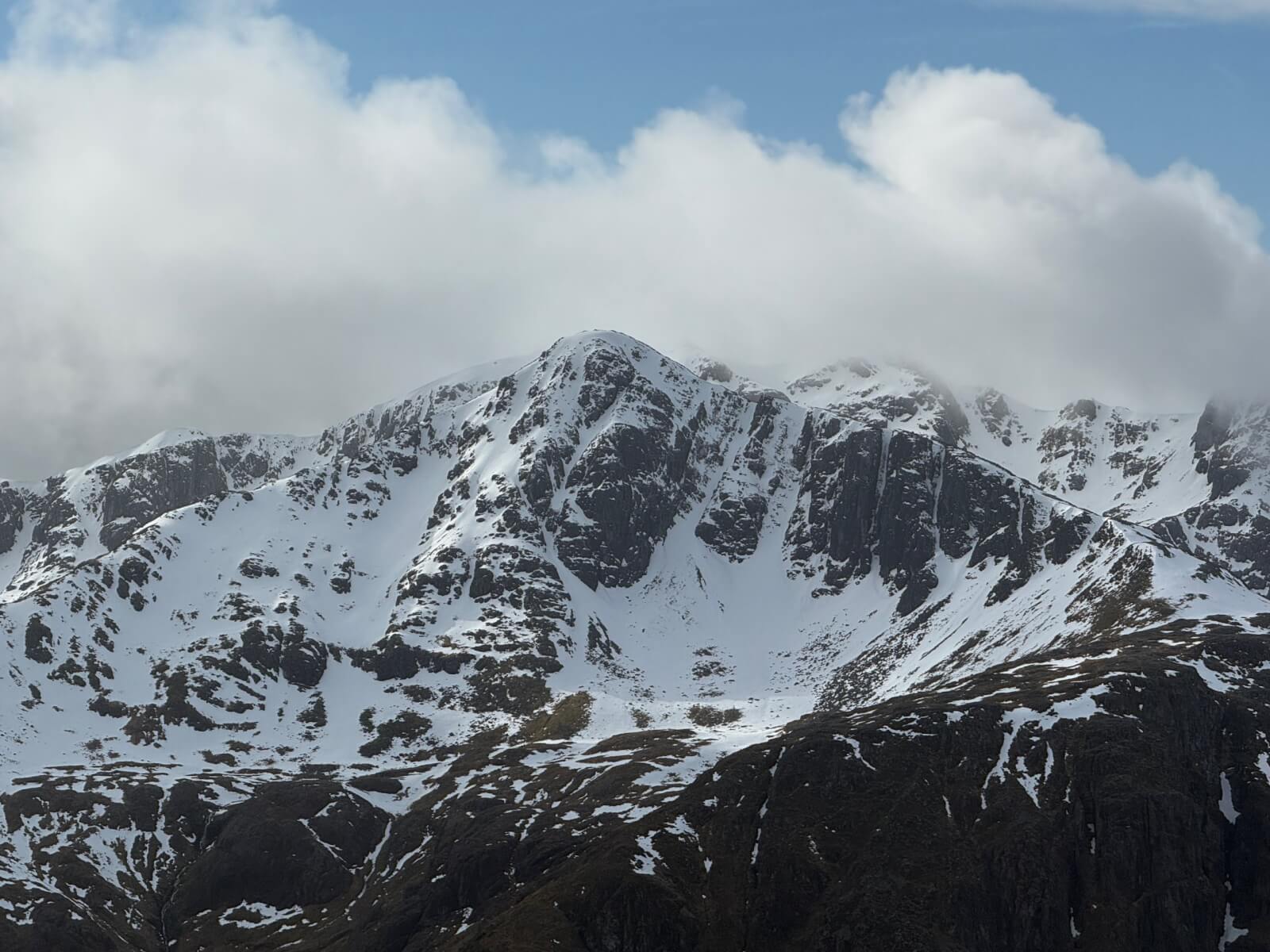 The period started off cold and dry giving some good blue sky mountain conditions. The snow cover has mainly been restricted to the higher slopes and corries with limited cover lower down the mountain, over the last couple of days much of the lower snow has disappeared but a good cover still exists high up mainly above 950 metres with the North and East facing corries having the greatest accumulations. Outlook is fairly mild and dry for the next day or so.