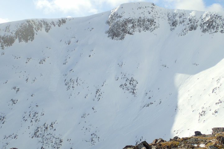 There has been a spell of great settled weather for much of the period with rain and much milder conditions arriving over the last couple of days. The snowpack initially was quite extensive albeit fairly thin and superficial at lower levels, with the thaw conditions affecting the area now much has gone leaving a generally soft moist but stable cover in the higher Northern and Eastern facing corries. Outlook remains mild and wet at times. Cornices will remain prone to collapse.