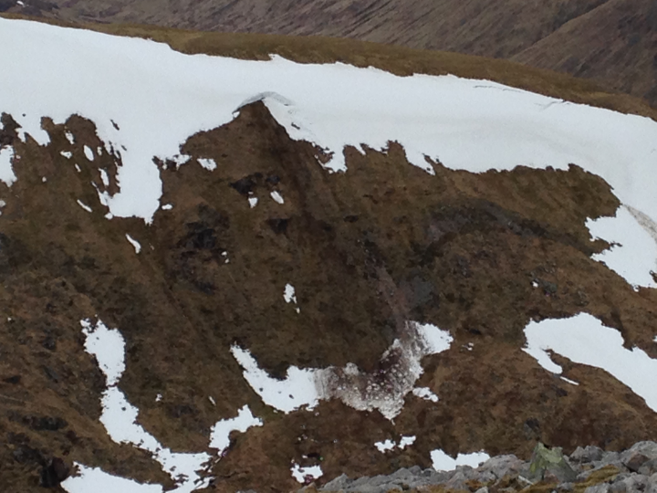 There were snow showers during Friday Saturday before the freezing level rose above the summits on Saturday night and heavy rain fell. This caused numerous substantial avalanches, including some large full depth ones in the Mamores running out to low levels. The freezing level fluctuated over the rest of the time with snow showers. Some avalanche activity was recorded, but they were not particularly large.