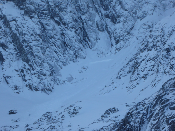 There were snow showers during Friday Saturday before the freezing level rose above the summits on Saturday night and heavy rain fell. This caused numerous substantial avalanches, including some large full depth ones in the Mamores running out to low levels. The freezing level fluctuated over the rest of the time with snow showers. Some avalanche activity was recorded, but they were not particularly large.