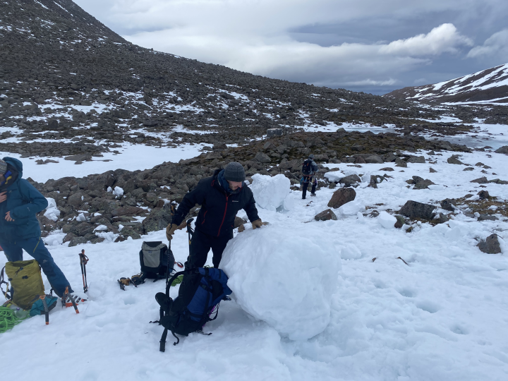 Limited firm snowpackInitially there was a shallow covering of snow, above 600 metres with firm patches of old snow beneath. Unsettled windy conditions arrived with significant snow loss. Most recently there have been further stormy conditions with fluctuating temperatures. Currently patches of firm stable snow remain above 1000 metres around coire back walls, shallow gullies and the plateau.