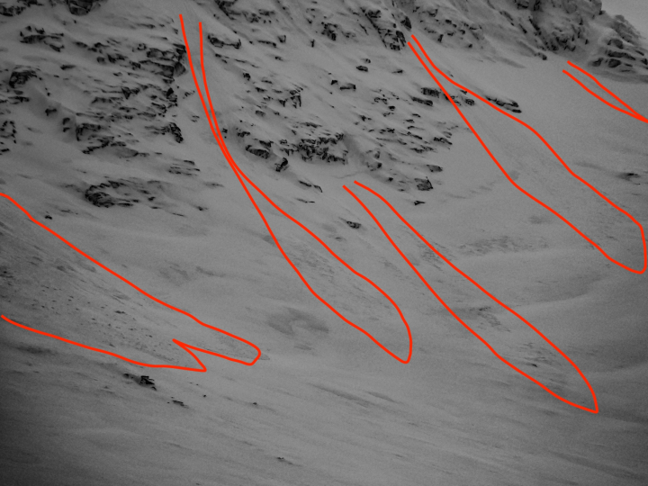 Soft windslabOver the past few days there has been a cold North to Easterly airflow with snow showers. Soft accumulations of windslab have been constantly developing since the early part of the week. Although these accumulations are consolidating fairly quickly, instabilities have been ongoing due to continual drifting of new snow.