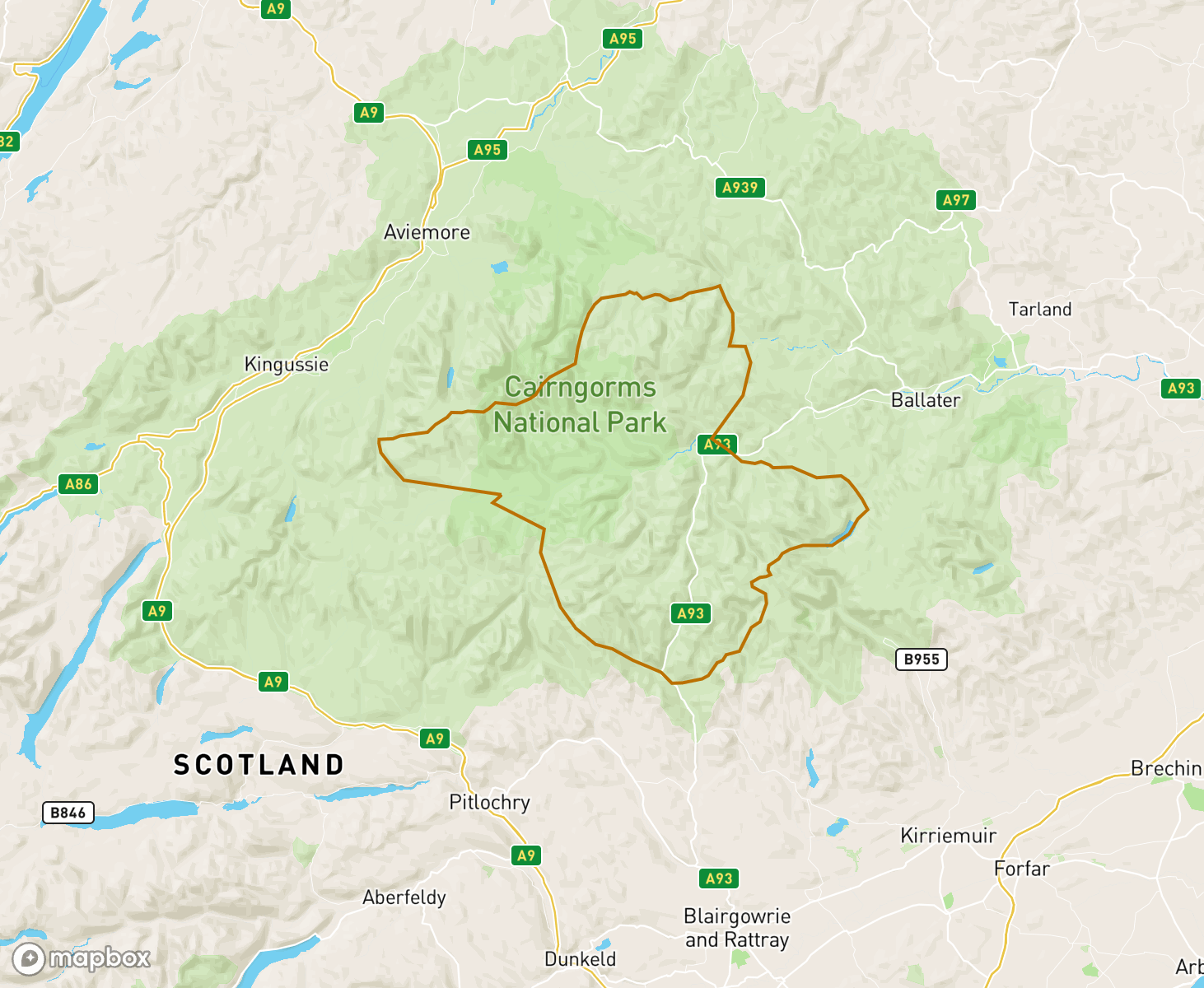 When producing daily avalanche forecasts for the Southern Cairngorms region the whole area and summits as indicated on the map are considered by SAIS forecasters when writing their daily reports.