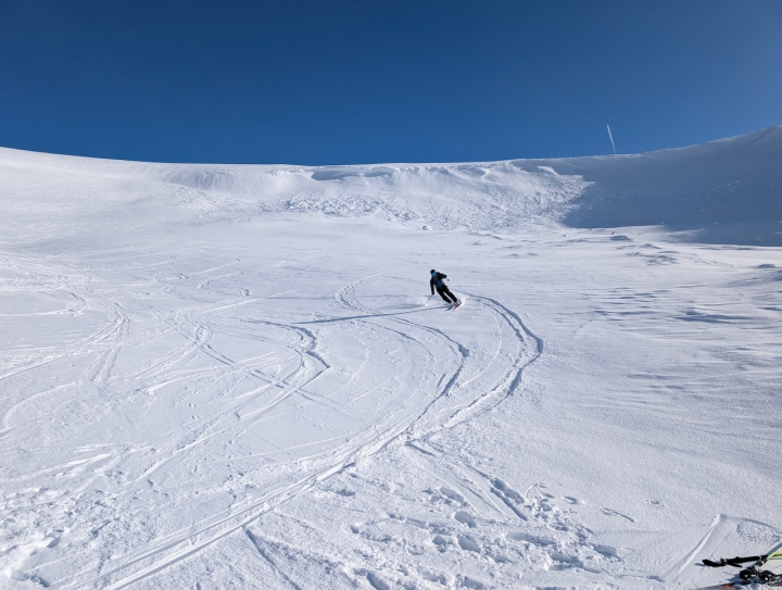 A stormy week.There has been snowfall most days this week which generally has been accompanied by very strong winds. Wind directions were variable, as a result the snowpack distribution improved with deepest accumulations in wind sheltered features but generally remaining shallow in many locations. The snowline currently starts around 700 metres with overall stability improving in fluctuating freezing levels.