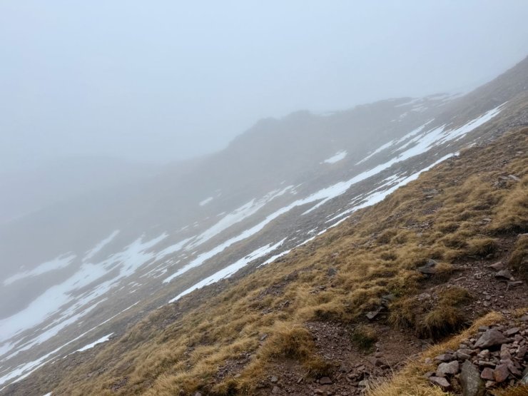 Thaw conditions.The period began with a little fresh snow which gave a welcome whiter appearance to the hills above 800 metres. This was mainly wet snow that was well bonded, and the hazard remained Low. As the week progressed milder conditions took over and this “fresher snow” thawed, leaving just the older snow remnants. Then very wet mild conditions set in which further depleted these old snow patches, leaving only patches of snow on mainly inland mountains around coire rims above 850 metres.